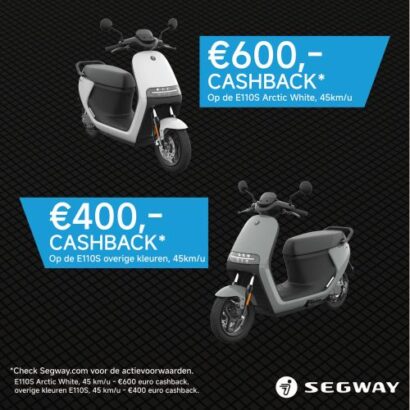 Cashback tot €600,- op de Segway E110S 45km uitvoering. Segway heeft een mooie actie voor de Segway E110S in de 45km uitvoering. Kiest u voor een wit exemplaar dan is de cashback €600,- in de kleur Steel Grey,…